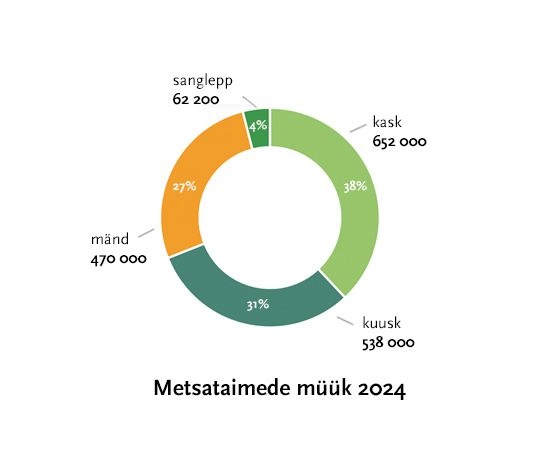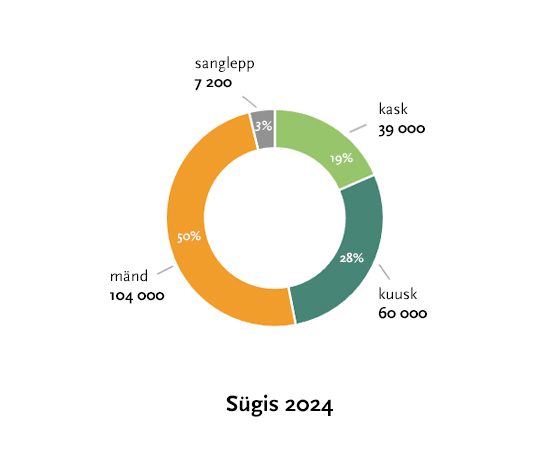 Sügisesed arvud näitavad, et 2024. aastal oli populaarseim mänd, ligi 50%-se (104 000) osakaaluga. Kuuske eelistati 28% (60 000) ulatuses ja kaske 19% (39 000).
