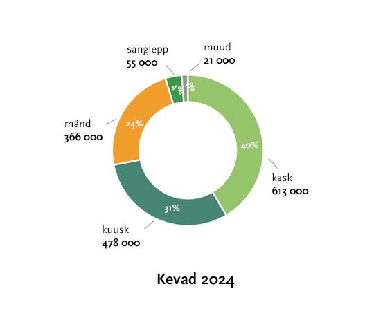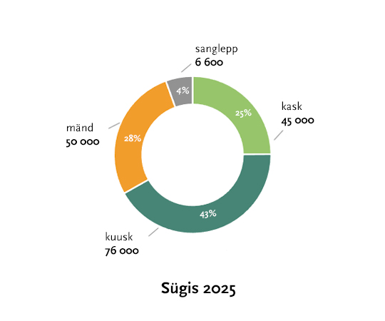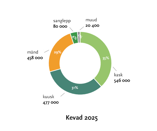 2025. aasta sügisel tõusis aga esile kuusk 43% (76 000), mänd 28% (50 000) ja kask 25% (45 000).